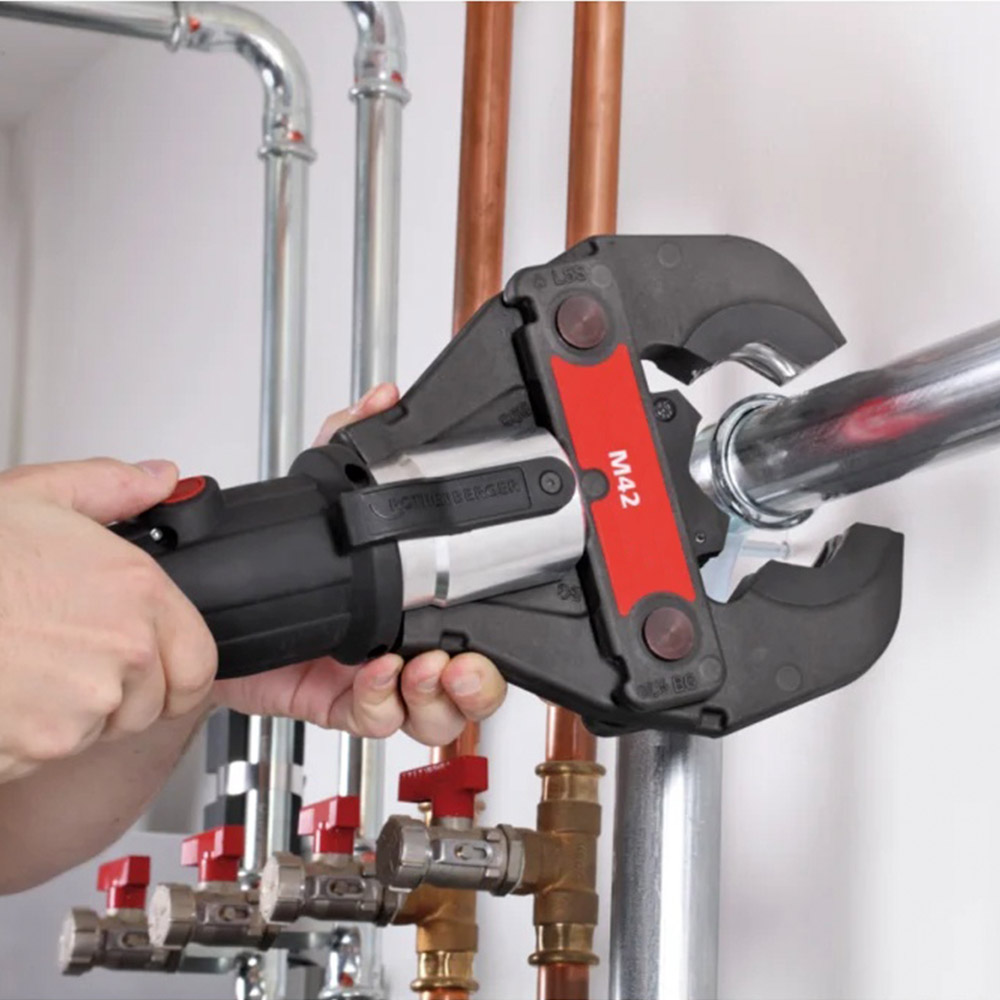 Fabricada en acero especial forjado, altamente resistente y flexible, ofrece una durabilidad superior y un prensado homogéneo en diámetros grandes. El mecanismo sincronizado de tres pernos facilita la apertura con un solo dedo y mejora la ergonomía. Es adecuada para prensas electrohidráulicas con empuje axial de 32–34 kN que trabajen con perfil M.