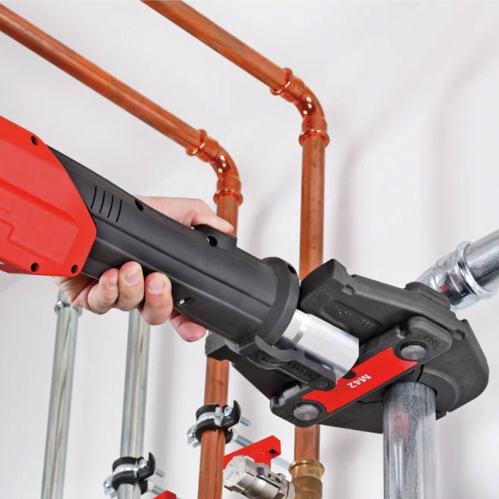 Para su uso es imprescindible disponer de una prensa electrohidráulica compatible de 32–34 kN y utilizar el perfil M en Ø 54 mm. Verifique siempre la compatibilidad del sistema de racores (material, perfil y diámetro) y siga las instrucciones de seguridad del fabricante.